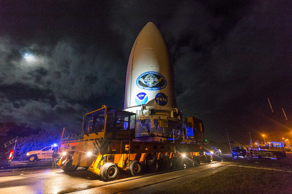 A már a rakéta orrkúpja alatt levő GOES-T műhold előkészületei az indításra a Kennedy Űrközpontban, február 17-én: útban az összeszerelő csarnok felé, ahol később felhelyezték az Atlas-5 rakéta tetejére. (Kép: United Launch Alliance)