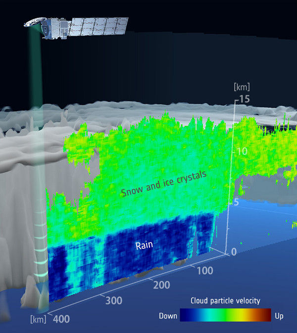 Az EarthCARE felhőprofilozó radarberendezésének adataiból készült első képek. A felső ábra a felhőket alkotó részecskék függőleges irányú koncentrációját mutatja a radarvisszaverő képesség változása alapján. A felhőzet legsűrűbb része a közepe. Lent a részecskék sebességtérképe a műholdra visszaérkező radarimpulzusok frekvenciájának Doppler-eltolódása alapján. A felső rétegeket alkotó, függőleges irányú sebességüket tekintve lényegében mozdulatlan hó- és jégkristályokkal szemben alul az esőzést okozó vízcseppek lefelé hullanak. Mindkét ábrán kb. 5 km-es magasságban egy éles határvonal vehető ki. (Kép: JAXA / NICT / ESA)