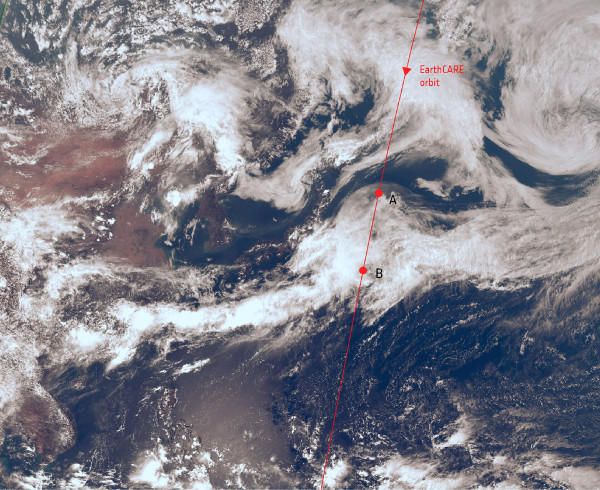 A vizsgált felhőzet magasabbról, egy japán geostacionárius meteorológiai mesterséges holdról (Himawari-9) készült optikai képen, amelyen pirossal bejelölték az alacsony pályás EarthCARE műhold pályájának a felszínre eső vetületét. A CPR fent bemutatott tesztmérései az A és B jelű pontok között készültek. (Kép: JAXA / Japan Meteorological Agency)