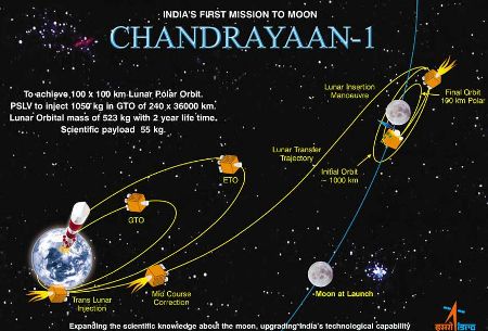 Az első indiai holdszonda október 22-én indult Sriharikotából, PSLV hordozórakétával. A kb. másfél méteres élhosszúságú kocka alakú, az üzemanyagot nem számítva 523 kg tömegű űreszköz a Holdat alig egy hét alatt éri majd el. Magával visz majd egy 30 kg-os penetrátort is, amely becsapódik a Hold felszínébe. A Csándráján-1 szonda végső pályája a felszín felett 100 km-re, a pólusok fölött húzódik majd.