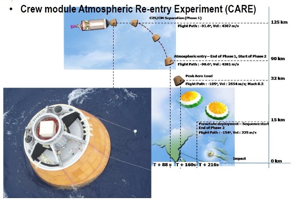 Az indiai visszatérő kabin (CARE) decemberi szuborbitális repülésének paraméterei. A kabin 125 km magasságig jutott fel, 4,3 km/s sebességet ért el, amikor levált a hordozórakétáról.