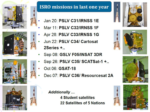 Az Indiai Űrkutatási Szervezet (ISRO) műholdközpontjának igazgatója nyolc sikeres startról számolt be. Ebből hetet indiai hordozórakétával hajtottak végre, a GSAT–18 távközlési műholdat viszont Ariane–5 rakétával Kourou-ból állították pályára. A startokról korábbi cikkeinkben beszámoltunk, az egyes műholdak feladatával és egyéb adataival együtt. Az indiai hordozórakéták a fő hasznos terhek mellett 4 diákműholdat, valamint 5 ország 22 különböző műholdját is pályára állították.