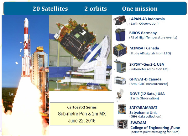 A startok közül kiemelkedik a PSLV (Polar Satellite Launch Vehicle) rakéta június 22-i startja (lásd korábbi cikkünket), amikor egyetlen indítással nem kevesebb mint 20 műhold került pályára. A fő műhold a napszinkron pályára került Cartosat–2 távérzékelő műhold volt, amely 2 méter felbontású multispektrális és 1 méternél jobb felbontású pánkromatikus felvételeket készít. A húsz műhold együttes tömege 1288 kg volt. (Később az egy indítással pályára állított műholdak számát tekintve ez a rekord a múlté lett, de a 104 műhold indítása már idén, sőt az ENSZ-es előadás elhangzása után történt, így az előadásban nem szerepelt.)