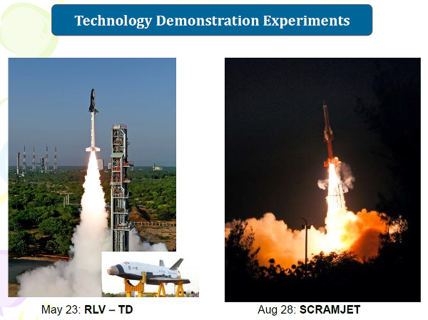 Nem a műholdstartok, hanem a technológiai kísérletek között szerepel az RLV (Reusable Launch Vehicle) többször felhasználható űrrepülőgép próbarepülése. Ugyancsak technológiai kísérlet volt a scramjet hajtómű kipróbálása. A scramjet hajtómű lényege, hogy amíg a rakéta a légkörben halad, a levegő oxigénjét használja oxidálószerként. Az indiai scramjet üzemanyaga hidrogén. A hajtóművet az induláskor 3277 kg tömegű ATV (Advanced Technology Vehicle) kétfokozatú, szilárd hajtóanyagú rakéta emelte magasba. Miután a rakéta két fokozata kiégett, 5 másodpercre bekapcsolták a scramjet hajtóművet, amely megfelelően működött. A rakétát a sriharikotai Satish Dhawan Űrközpontból indították, a 300 másodpercig tartó repülés végén a jármű mintegy 320 km-re az indítóhelytől leérkezett a Bengáli-öböl vizére. Ezzel India negyedik országként próbálta ki saját scramjet hajtóművét.