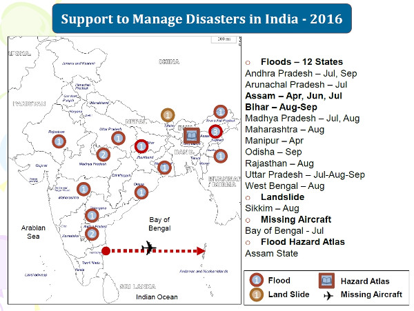 Az indiai űrprogram gerincét a különböző alkalmazások jelentik. Ezek között fontos a katasztrófahelyzetek kezelése, amelyek közül a legsúlyosabb gondot az árvizek jelentették. Az ISRO műholdjait 12 állam 16 árvízi helyzetében használták fel, de emellett egy földcsuszamlás felmérésére, egy, a Bengáli-öböl térségében eltűnt repülőgép keresésére és Assam államra az árvízi kockázatokat tartalmazó atlasz összeállítására is felhasználták.