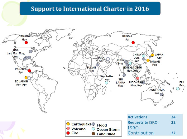 Az ISRO aktívan részt vesz az ENSZ által létrehozott, a katasztrófahelyzetek kezelését segítő nemzetközi együttműködésben (Disasters Charter). Ennek keretében tavaly 22 alkalommal kérte a szervezet az ISRO segítségét, a kérést mindannyiszor megfelelő adatszolgáltatással teljesíteni tudták.