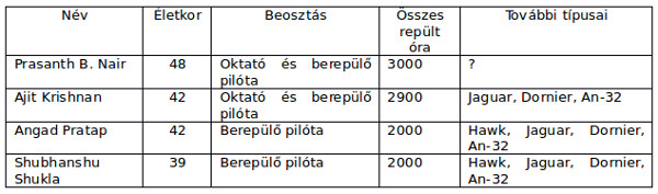 Ugyanezen a napon újabb információk láttak napvilágot az előző nap bemutatott négy indiai űrhajósjelölt és a Gaganján (Gaganyaan) űrhajó berepülési programjával kapcsolatban. Ismertették a Gaganyaan-berepülők néhány személyes adatát és repülési tapasztalatát. Ezek szerint valamennyiük rendelkezik típusjogosítással a Szu-30MKI, Mig-29, Mig-21-es hangsebesség feletti sugárhajtóműves típusokra. Ezen kívül más típusokat is repülnek, mint pl. a sugárhajtóműves brit Hawk kiképző és Jaguar alacsony támadó, vagy a turbólégcsavaros könnyű szállító Dornier, illetve a szintén turbólégcsavaros orosz An-32 közepes szállítógépet – lásd táblázatunkat.