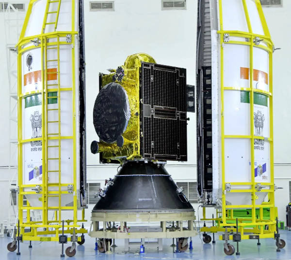 Az NVS-02 még a földi szerelőcsarnokban, a startra való előkészítésekor, mellette oldalt a hordozórakéta orrkúpjának két fele. (Kép: ISRO)