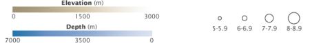 A mostani volt a Földön mért ötödik legerősebb rengés 1900 óta. A térképen a mostani földrengés-tevékenységét ábrázolták. A körök a földrengések Richter-skálán mért nagyságát szimbolizálják: pontozott vonallal az előrengéseket, folytonos vonallal az utórengéseket. A fő rengés a legnagyobb kör. A szürke színskála a szárazföldön a tengerszint feletti magasságot, a kék a tengerfenék mélységét jelöli. A fő rengés mintegy 24 km-rel a tengerfenék alatt pattant ki. (Kép: NASA EO / R. Simmon, J. Allen / SRTM - University of Maryland / British Oceanographic Data Center)