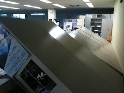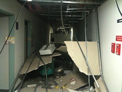 Károk a JAXA központ belsejében a 2011. március 11-én történt nagy erejű földrengés után. Egyes jelentések szerint az épület tetőszerkezetének egy része is összeomlott. (Kép: JAXA)
