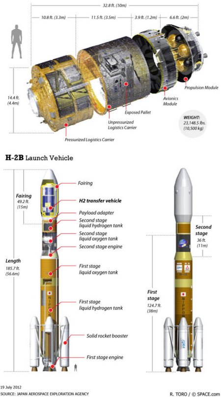 A japán teherűrhajó, valamint az indítására használt H2-B hordozórakéta méretei és felépítése. (Kép: R. Toro / Space.com; adatok: JAXA)