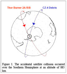 Nos az SSN bejelentése szerint két Föld körüli ütközés szereplőjét sikerült a közelmúltban azonosítani. Az egyik esemény 2005. január 17-én 885 km magasan történt, amikor egy 31 éve indított amerikai Thor Burner 2 hordozórakéta (COSPAR azonosítója: 1974-015B, SSN azonosítója: 26207, baloldali fotó) és egy 2000. márciusában felrobbant kínai CZ-4 rakéta harmadik fokozatának (COSPAR azonosítója: 1999-057CV, SSN azonosítója: 26207, jobboldali fotó) darabjai „találkoztak” a déli sarkvidék felett. Persze itt nem két teljes rakéta ütközéséről van szó. A radar-mérések szerint a Thor Burner rakétáról három kisebb darab szakadt le (SSN számok: 28591-28593), melyek közül a legnagyobb mérete is kisebb volt 1 négyzetméternél, míg a kínai rakéta darabja 0,06 négyzetméter volt.