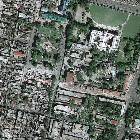 Az amerikai GeoEye-1 műhold szerdai felvételén Port-au-Prince egy részlete látható. Jobbra fent az összeomlott elnöki palota. Kivehetők a törmelékkel borított utcák és az embertömegek is. (Kép: GeoEye)