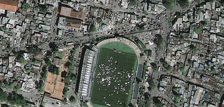 Ugyanennek a felvételnek egy másik részlete Port-au-Prince stadionját mutatja, amelynek gyepén a segítségre váró emberek gyűltek össze. (Kép: GeoEye)