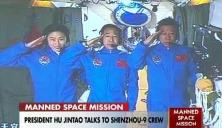 Balról jobbra: Liu Jang, Csing Haj-peng és Liu Vang, amint tisztelegnek Hu Csin-tao kínai államfőnek, aki látogatást tett a pekingi irányító központban. (Kép: CCTV)