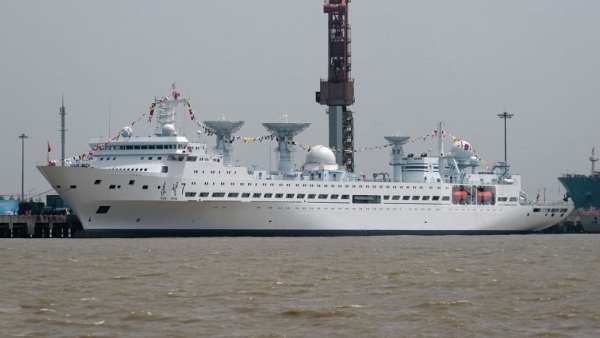 A Jüanvang-7 fedélzetén a legfeltűnőbb a három, 10-12 m átmérőjű követőantenna. A hírek szerint a hajó akár 100 napot is képes eltölteni a nyílt tengeren. (Kép: hobbyshanghai.com.cn)