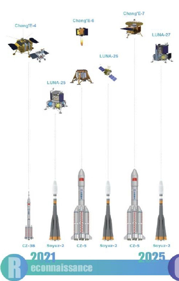 Az ILRS létesítésének első szakasza a Csang’e–4 küldetéssel már elkezdődött és 2025-ig tart, három orosz és három kínai küldetéssel. (Kép: CNSA–Roszkoszmosz, COPUOS prezentáció)
