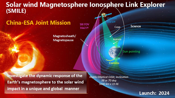 A 2024-re tervezett, az ESA-val közösen készítendő SMILE a napszél és a magnetoszféra/ionoszféra kapcsolatát fogja vizsgálni, erősen elnyúlt poláris vagy közel poláris pályáról. Földközelben 5000 km-re közelíti meg bolygónkat, míg földtávolban 19 földsugár távolságra, azaz mintegy 120 ezer km-re távolodik el. (Kép: NSSC CAS, COPUOS prezentáció)