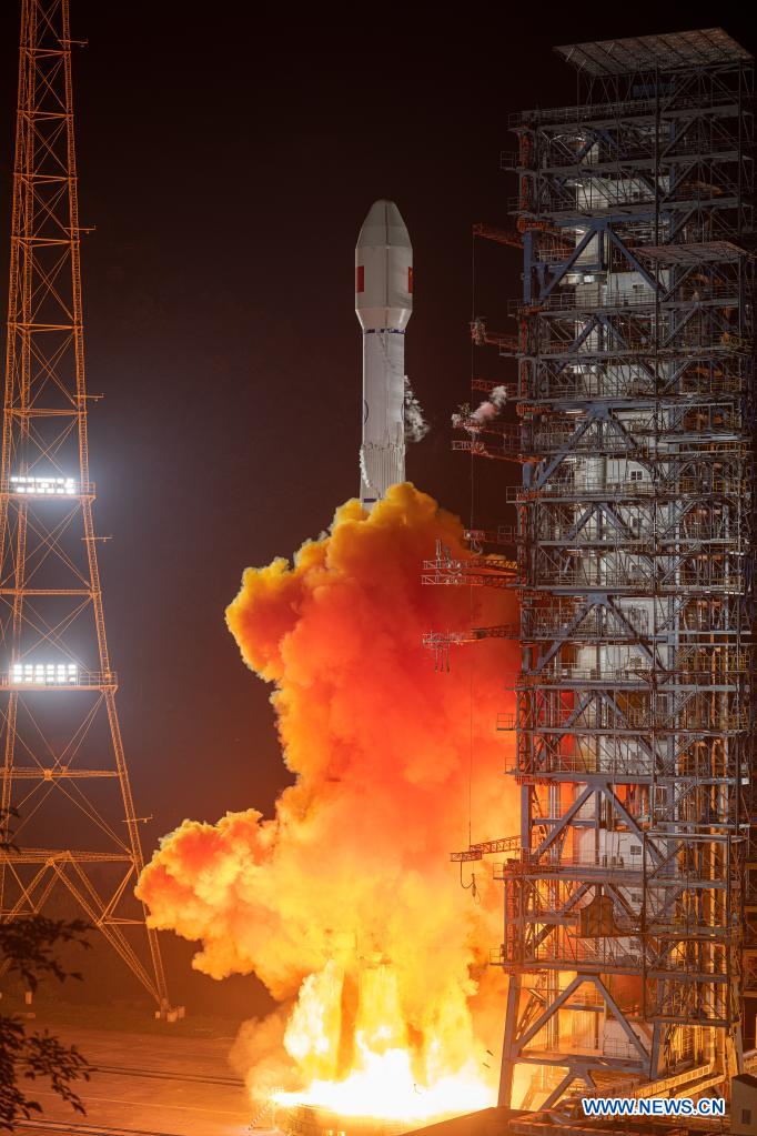 A Chinasat-2E augusztus 5-én, magyar idő szerint 18:30-kor emelkedett a magasba. Az időeltolódás miatt az egész országban érvényes pekingi zónaidőben számítva már 6-án, éjfél után fél órával történt az esemény, ezért az éjszakai háttér. (Kép: Xinhua / Guo Wenbin)