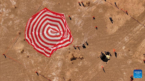 Az elszenesedett külsejű kabin (jobbra alul) és az ejtőernyő már a földön, felülnézetből. (Kép: Wang Heng / Xinhua)