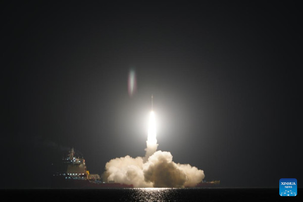 A Ceres-1S rakéta (Y4) a Dél-kínai-tengeren, Santung (Shandong) tartomány partjai közelében állomásozó indítóplatformról (Bo Run Jiu Zhou) emelkedett a magasba. (Kép: Guo Jinqi / Xinhua)