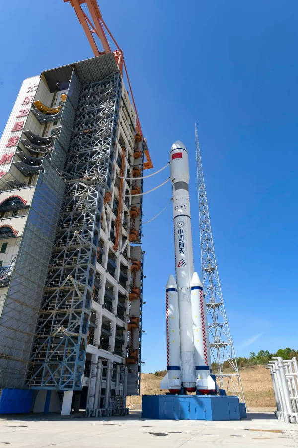 Az előző Kuovang küldetést indító Hosszú Menetelés-6A rakéta a startra való előkészületekkor. (Kép: SAST)