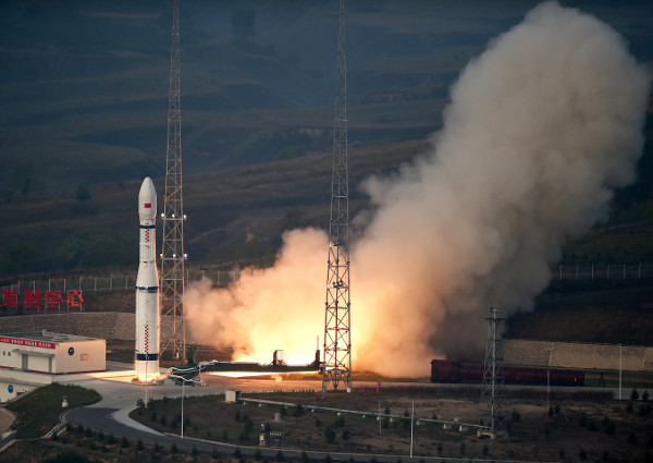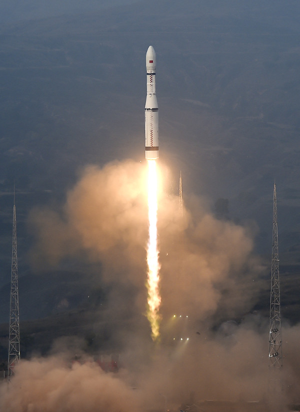 15 évvel a koncepció megszületése, és 6 évvel a fejlesztések megkezdése után startolt az első háromfokozatú, közel 30 m magas CZ-6 hordozórakéta Tajjüanból, a kiszolgálására felépített új indítóállásról. (Kép: Xinhua)