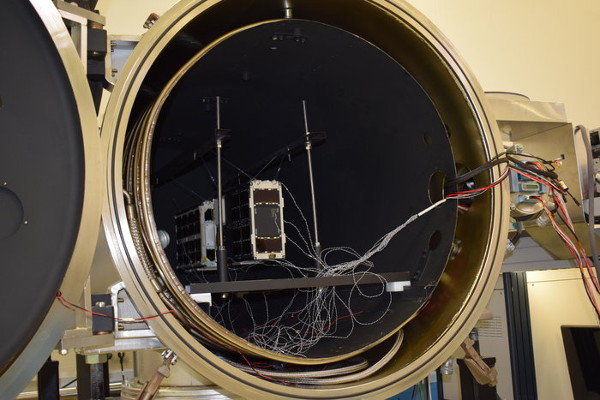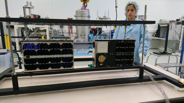 A két műhold az ESA Mechanikai Rendszerek Laboratóriuma termovákuum kamrájában. (Kép: ESA / GomSpace)