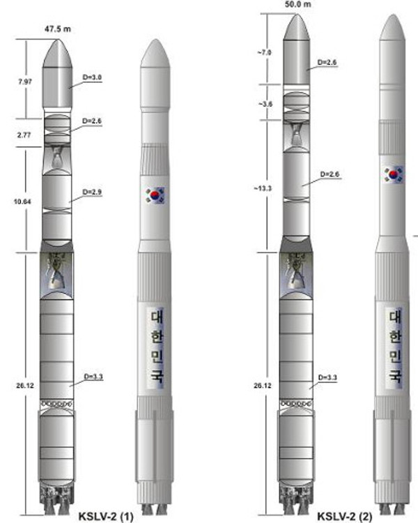 A 200 tonna induló tömegű KSLV-2 (1) egyelőre csak tömegmakettel repült.