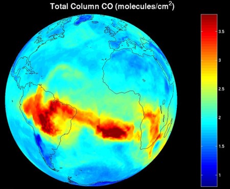 Az első ábrán a légköri szén-monoxid (CO) oszlopsűrűsége látható 2005. szeptember 30-án. A színskála a gáz oszlopsűrűségét mutatja molekula/cm2 egységben. A szén-monoxid legnagyobb mennyiségben nagy erdőtüzek során, vagy az emberi tevékenység (ipari üzemek, közlekedés, fűtés, vagy például a nálunk még mindig „divatos” tarlóégetés) következtében keletkezik. A becslések szerint a Földön a szén-monoxid kibocsátásának feléért közvetlenül az emberek felelősek. Az ARIS adatsorai alkalmasak arra, hogy a gáz nagyobb felhőinek mozgását is kövessék a légkörben. A kép készítésének idején az Amazonas medencéjében a biomassza égetésekor keletkezett szén-monoxid az Atlanti-óceán fölé jutott. Feltűnő még az Afrika déli részén égő tüzek hatása.