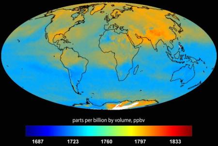 A metán (CH4) koncentrációja a troposzférában, 2005 augusztusában. A színskála egységei a térfogat milliárdod részében (parts per billion, ppb) értendők. Az ehhez hasonló képek segítenek azonosítani ennek az üvegházhatású gáznak a természetes vagy mesterséges kibocsátó forrásait.