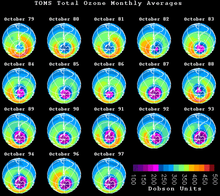 Az ózonlyuk októberi képe 1979 és 1997 között. Az 1995-ös év hiányzik, akkor épp nem volt működő TOMS műszer a világűrben. (Kép: NASA GSFC)