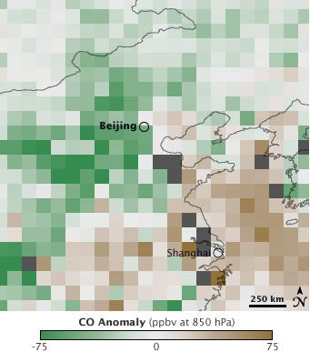 A felső képen a NASA Terra műholdjának MOPITT (Measurements of Pollution in the Troposphere) szenzorával a szén-monoxid troposzférikus koncentrációjáról kapott adatokat szemléltették. A 2008. augusztusi adatokat az előző három év (2005, 2006 és 2007 augusztusa) méréseivel vetették össze. Barna színnel azok a helyek láthatók, ahol nőtt, zölddel pedig azok, ahol csökkent a szennyezettség. Peking és vidéke egyértelműen ez utóbbi kategóriába tartozik: a gáz koncentrációja kb. 20%-kal csökkent. A műholdas mérések – a földfelszíniekkel ellentétben – nem egy adott ponton érvényes adatot szolgáltatnak, hanem egy kiterjedtebb területre vonatkoznak. A szén-monoxid térképén egy-egy pixel egy 100 km-es oldalú négyzetnek felel meg. A kevesebb szén-monoxid miatt csökken a szmogképződés valószínűsége. Az emberi szervezetben a CO hatására a vér kevesebb oxigént képes a létfontosságú szerveink felé szállítani.