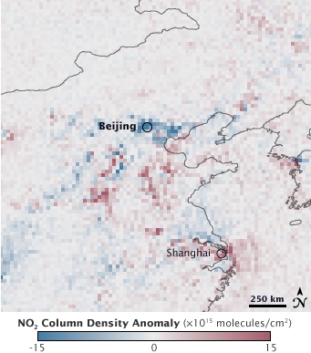 A nyári olimpiai játékok előtt és alatt a kínai főváros környékén korlátozták a levegőt szennyező kibocsátó forrásokat. Műholdas mérések alapján az intézkedések sikerrel jártak.