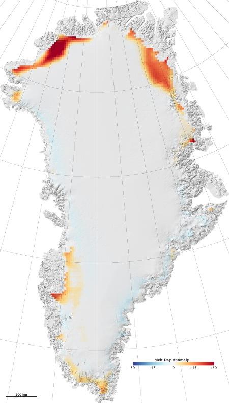 A grönlandi jégtakaró különösen az északi partoknál szenvedett extrém olvadást 2008 nyarán. Az alábbi térképen azoknak a napoknak a számát ábrázolták piros színnel, amelyeken olvadás történt. Az összehasonlítási alapot (a fehérrel jelzett 0 értéket) az 1979 és 2007 közötti évekre jellemző átlagérték jelenti.