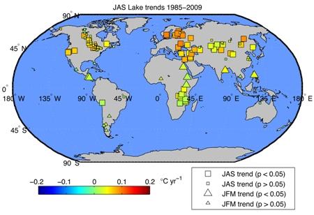 Az hőmérséklet-növekedés átlagos sebessége tíz évenként 0,45 Celsius-fok, de egyes tavak vize 1 °C/évtized sebességgel melegszik. A kimutatott hatás globális, a legnagyobb növekedést az északi félteke közepes és magas földrajzi szélességei mentén tapasztalták.