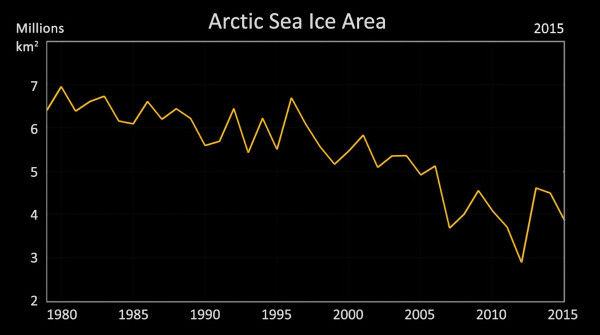Ugyanez az ingadozás a diagramon is látható, mindamellett feltűnő az általános csökkenő tendencia. Ennek illusztrálására az animációból két képet külön is bemutatunk, az 1980-as legnagyobb kiterjedésű „minimumot”, illetve a 2012-es legkisebb minimumot. Utóbbi évben a jégtakaró kiterjedése még az 1980-as minimum felét sem érte el (1980-ban 7,01 millió km2, illetve 2012-ben 2,91 millió km2 volt, míg az animáció utolsó évében, 2015-ben 3,885 millió km2 volt).
