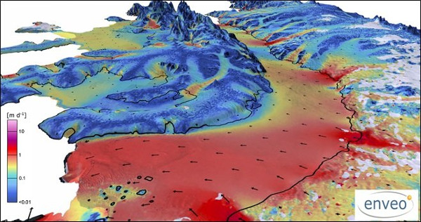 A jég 2014–2016 közötti átlagos mozgási sebessége a Sentinel–1 műholdak mérései alapján. (Kép: J. Wuite, ENVEO)