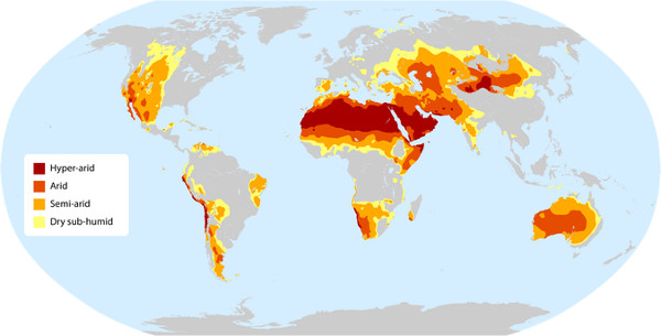 Az ENSZ Élelmezésügyi és Mezőgazdasági Szervezete (FAO) felmérése szerint a Föld felszínének mintegy 40%-át teszik ki a száraznak tekintett területek, ahol az éves csapadékmennyiség nem éri el az 1300 millimétert, vagy sok helyütt még annál is jóval kevesebb, és általában erőteljes a párolgás. Mindamellett, ezek a területek sokfélék, a préritől és a szavannától a mediterrán éghajlatú területeken keresztül a kőkemény, valódi sivatagokig. (E definíció szerint hazánknak még a legcsapadékosabb területei is száraz vidéknek számítanak.) A területek viszonylag szárazak ugyan, mégis sok helyütt számottevő kiterjedésű erdők borítják.