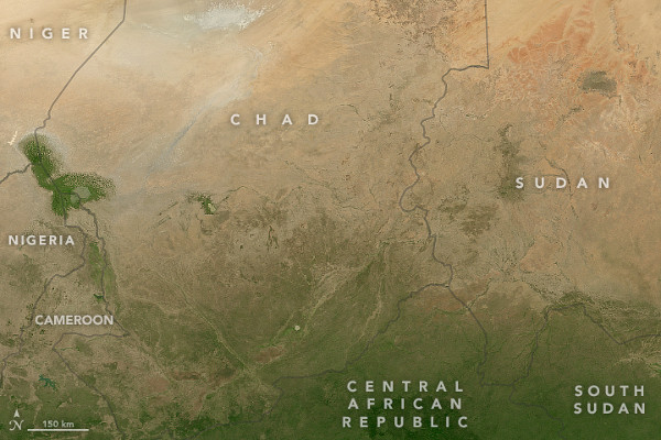 A MODIS spektrométerrel nehéz az erdők azonosítása a száraz vidékek peremén, például a Szahara és a trópusi őserdők közötti, a képen látható területen. (Kép: NASA Earth Observatory, 2015-ös MODIS felvételekől összeállított kép)