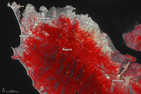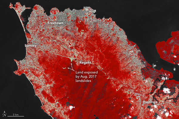 A képeket összehasonlítva az urbanizáción kívül láthatók Freetowntól délre az erdőirtás nyomai is, ami ugyancsak hozzájárul a földcsuszamlás kialakulásához. A Sierra Leone-i Mezőgazdasági Kutatóintézet Landsat felvételeken végzett felmérése szerint a sűrű erdővel borított terület az 1986-os 113 négyzetkilométerről 2015-re 59 négyzetkilométerre csökkent, ami 52%-os fogyást jelent. Eközben a főváros lakossága 1986-tól napjainkig megkétszereződött, félmillióról egymillióra nőtt. Terjeszkedését felgyorsította az országban 1991–2002 között pusztító polgárháború, mert a harci cselekményeknek jobban kitett falusi területekről a városba menekültek az emberek. Kapcsolódó cikkek: Kapcsolódó linkek: