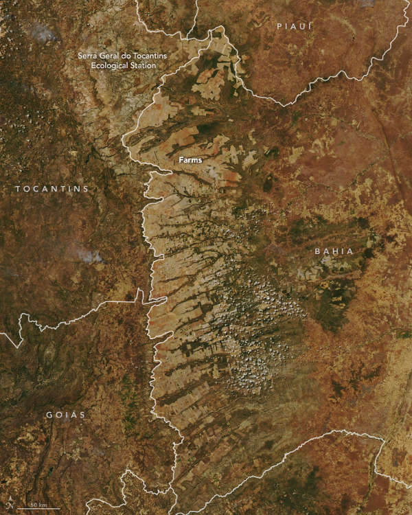 A folyamatot eredményét természetesen műholdképek segítségével is meg lehet figyelni. Brazília szavannás területei az Amazonas folyó és az Atlanti-óceán partjait övező erdőségek között fekszenek. Közel ezer madár- és háromszáz emlősfaj élőhelyéről van szó, többek között itt él a veszélyeztetett jaguár és sörényes farkas.