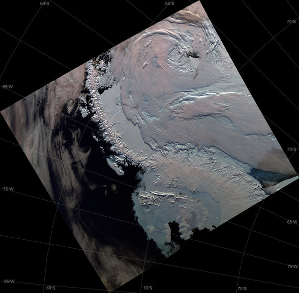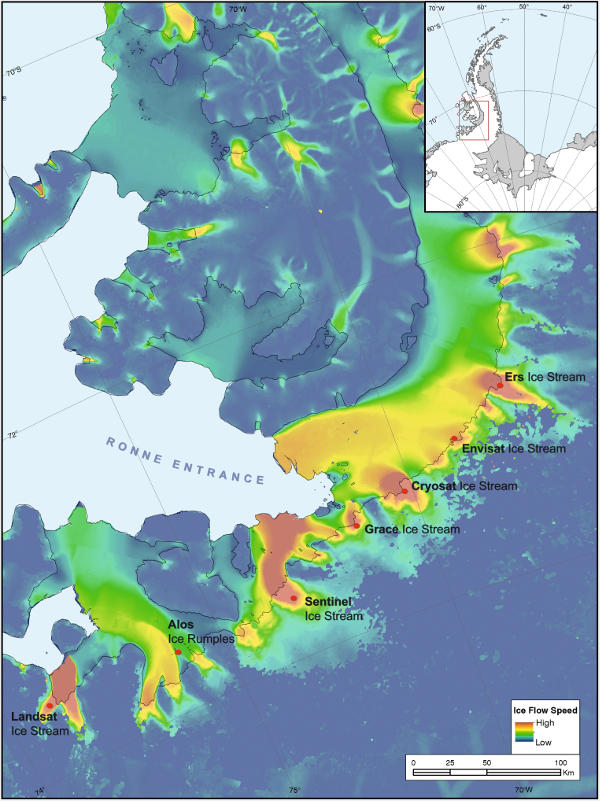 A műholdakról elnevezett gleccserek az Antarktiszi-félsziget délnyugati partján, a VI. György-szoros és az annak bejáratát alkotó Ronne-bejáró mentén sorakoznak. (Kép: CPOM)