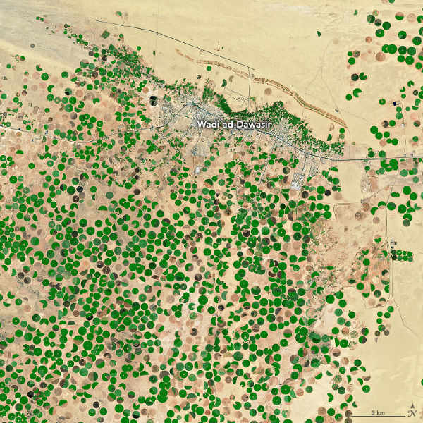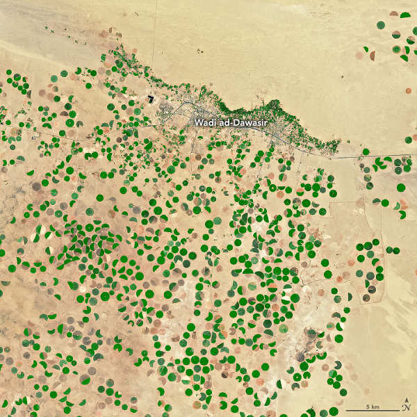 Az alábbi, Wadi ad-Dawasir település környékét ábrázoló műholdképpár a NASA Terra földmegfigyelő műholdjának ASTER (Advanced Spaceborne Thermal Emission and Reflection Radiometer) műszerével készült, az egyik 2000-ben, a másik 2017-ben. Az időközben eltelt közel két évtized alatt jól láthatóan elterjedt az öntözéses mezőgazdasági művelés, amihez a mélyből, a víztároló rétegekből termelik ki a talajvizet. A parcellák kör alakja az öntözés módjával van kapcsolatban. A kutak a terület közepén vannak, a vizet körben forgó csővezetékek juttatják el a növényekhez. Ahová nem érnek el a csövek, ott nem élnek meg a növények, a sivatag az úr.