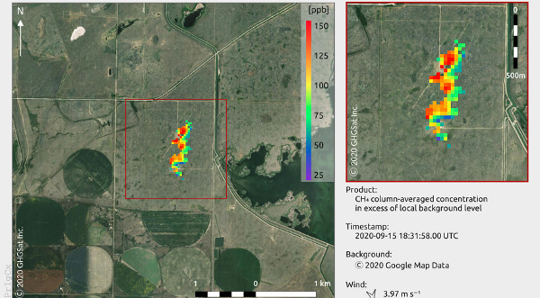 Az új műholddal a tesztelése érdekében az Alberta (Kanada) területén, ellenőrzött körülmények közt létrehozott metánkibocsátás helyét figyelték meg. A műholdas mérési eredményeket helyszíni és repülőgépről végzett vizsgálatok eredményeivel vetették össze. (Kép: GHGSat)