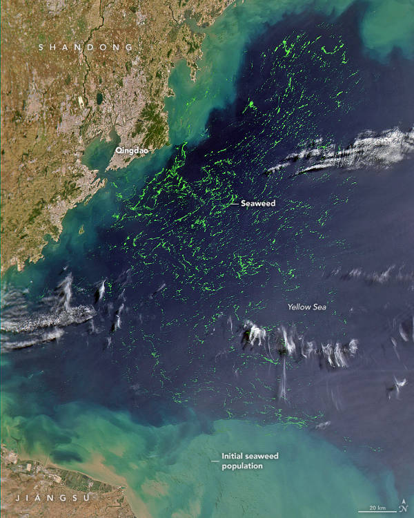 Chuanmin Hu, a Dél-Floridai Egyetem oceanográfusa szerint a legtöbb kutató egyetért abban, hogy az Ulva prolifera erőteljes virágzását elsősorban a Sárga-tenger délnyugati partját alkotó Csiangszu tartományban létesített kiterjedt akvakultúrák okozzák. A nagyobb területet ábrázoló kép alsó részén a tompább zöld területek Hu szerint a hínár eredeti populációját mutatják. A szél, a tengeri áramlatok és az emberi tevékenység következtében azonban a hínár egy része leválik erről a területről, majd a szél és a tengeráramlás hatására észak felé, Santung tartomány partjai irányába sodródik, ahol a fénynek és a bőségesen rendelkezésre álló tápanyagoknak köszönhetően megkezdődik heves virágzása.