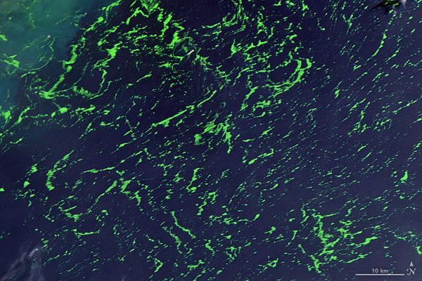 A mostani algavirágzás feltűnő azon a felvételen, amelyet a SeaHawk CubeSat Hawkeye szenzora 2021. június 19-én a látható tartományban készített. A SeaHawk és a hasonló műholdak felvételei azoknak a szakembereknek a munkáját segítik, akik megpróbálják azonosítani a robbanásszerű algavirágzást kiváltó okokat. A képen a zöldmoszatok közé tartozó Ulva prolifera nevű zöld makroalga (tengeri hínár) látható. Az alga nem mérgező, sem az emberre, sem a tengeri élővilágra nézve, sőt a „tengeri salátának” is nevezett növény ehető és tápláló. Kiterjedt szőnyegei azonban romboló hatással vannak a tengeri ökoszisztémára. Az elbomló algák például oxigénben elszegényítik a vizet, ami halpusztulást okoz. A hínár partra vetődő csomói csúnya látványt nyújtanak, eltávolításuk pedig költséges.