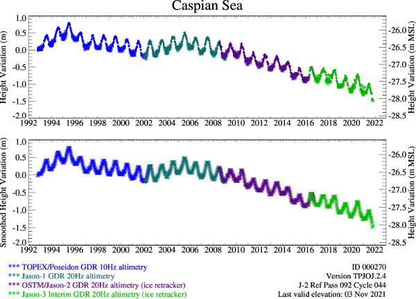 A Kaszpi-tenger vízszintjének hosszabb távon csökkenő tendenciájú ingadozása több műhold mérései alapján. A jobb oldali függőleges tengelyen a vízfelszín „tengerszint alatti mélysége” látható. A diagramról leolvasható, hogy az 1990-es évek közepe óta a vízszint mintegy 1,5 méterrel csökkent. Ugyanezen időszakban a világtengerek vízszintje kevesebb mint 10 centiméterrel nőtt (átlagosan 3,4 mm/év). (Kép: NASA Global Water Monitor)