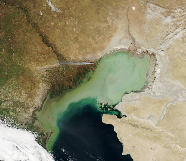A Kaszpi-tenger a NASA Terra műholdja közepes felbontású képalkotó sugárzásmérőjével (MODIS) 2003. június 11-én készített felvételen. A tenger északi medencéjében már csaknem két évtizeddel ezelőtt is jól láthatók voltak a tengeri élővilágra káros hatású eutrofizáció jelei. Az eutrofizációt a mezőgazdasági területekről bemosódó műtrágya, és az ennek hatására elszaporodó algák okozzák. A Volga torkolata környékén a zöld és kék elszíneződés utal az erős algásodásra. (Kép: Wikipédia, MODIS Rapid Response Team, NASA / GSFC)