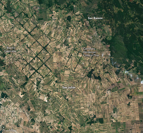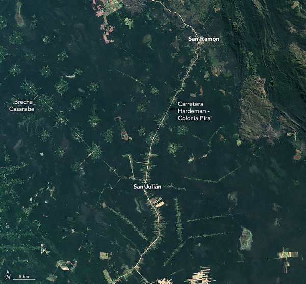 A terület Santa Cruz de la Sierra várostól keletre terül el, a Chiquitano-erdőség egy részének helyén. A 230 ezer négyzetkilométer területű Chiquitano-erdőség egy trópusi lombhullató monszunerdő, amely az Andoktól keletre, Bolívia és Brazília alacsonyabban fekvő területein, a trópusi esőerdőktől délre terül el. A képen látható területen, a monszunerdő helyén mezőgazdasági művelésre alkalmas területeket alakítottak ki.